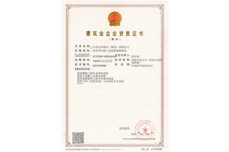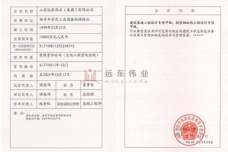 • 建筑幕墻工程專業(yè)承包壹級 建筑工程施工總承包貳級 建筑裝修裝飾工程專業(yè)承包貳級