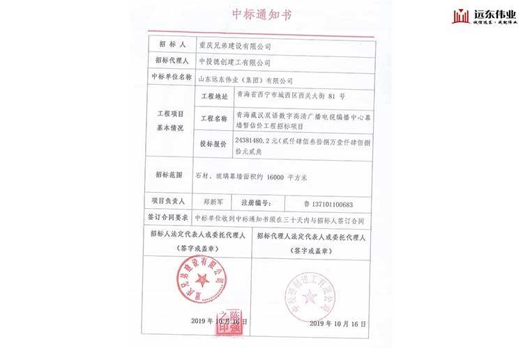 • 青海藏漢雙語數(shù)字高清廣播電視編播中心幕墻工程、中標(biāo)通知書(鄭新軍)